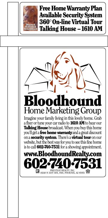 Just when you thought the pictures couldn't get any bigger... And this is one-sixth the size of the real finished product. These suckers will be huge. I apologize if I'm boring yo with all this real estate stuff, but this is literally all I am doing right now, 18, 20 hours a day. Making lemonade, when the Arizona Department of Real Estate threw a spanner in my works, they conferred upon me a gift of time, at least. This particular problem, the problem of yard signs, was one I had put off. And since any signs I make now will have to be replaced in May, when we can lawfully use the name we want to use, that also gifted me with a 'Free Play' card for experimentation. The name we're working with here, Bloodhound Home Marketing Group--that ungainly mouthful--is under consideration by the ADRE. I'm using it on spec, because I have to have something to work with. If I get lucky, I won't have to change it yet again. Anyway, what's going on here is a pretty radical marketing idea. Marketing is not mere advertising, and marketing is not throwing spit-balls up against the wall and hoping that something sticks. Profitable marketing originates in a central idea of a business that drives every decision: This is who we are. In every way we can think of, we're saying, "We are not like everybody else." The name, the dog, the logo, the color scheme, the look and feel of our printed pieces, the confidential style of persuasion in the text, the repeated in-your-face challenges to preconceptions about Realtor marketing--all of it is devised to call attention to the differences we bring to the table. Even the "we," which belies all the "me, me, me" of Realtor advertising. But this sign is as far as we've pushed things--and it may prove to be too far. First the easy stuff: The average Realtor yard sign is really a brokerage sign. It is red-white-and-blue, its type set much too loose in clumsy gothic sans serif faces. The phone number will often be the broker's main switchboard line, rather than the lister's cell phone, which I think is just plain stupid. The sign will normally be 18 inches wide by 12 inches deep, 216 square inches. It will say nothing about the house. The lister will put his name and phone number and a few features of the home on 'riders' strung beneath the broker's sign. One of the riders will say, "I'm gorgeous inside!," which cannot be parsed in any way but this: "I look like a dump from the street!" In contrast, the Bloodhound signs you see here are white and delicate in color. They use ITC Clearface, every letter of it set and kerned by me. The phone number is mine, and I never promote any other number. (Realtors seem to be proud of how many phone numbers they can cram on their business cards. They must think it makes them look important, like those jackasses who walk around all the time carrying dozens of keys. To me, it says, "I have contempt for your time. I want you to waste all afternoon trying to track me down." That, incidentally, is how you interpret the marketing message behind what looks like a simple, perhaps unconsidered, decision.) I have to mention my broker "prominently," but I ain't spending one cent more than I have to on him. As to size, I think bigger is much better. The top sign is 24 inches wide by 9 inches deep--the same 216 square inches as the main brokerage sign. The bottom sign is 24 inches wide by 36 inches deep, 864 square inches. Taken together, the two signs are 1,080 square inches, five times the size of the brokerage sign. There will be no cheesy riders slung below. But that's just mechanics: A Howitzer can be as inaccurate as a sling shot. The question is: What makes the frog jump? Forever and always, Realtors have treated their yard signs like billboards. After all, the traffic is driving by, so all you can hope to do is let them know this home is for sale, right? Well, maybe. Writing a billboard that sells is a monstrous job precisely because your prospect is inherently isolated from any possible point of sale. Is that true of a potential home buyer? More significantly, isn't the information on a Realtor's sign at war with the billboard idea? Who takes down a phone number from a billboard? And who can read text from a Realtor's sign that might run to 30 or 40 words, all told, without stopping? And why, dear god, would anyone want to encourage people to not stop?!? The whole point of a Realtor's sign is to get people to stop and look at and buy the house. If the whole point of the exercise is to promote a fleeting visual awareness that some particular house is for sale, with no action sought or expected, then the whole effort is wasted. On the other hand, if a Realtor's yard sign is not really a billboard, but is instead, in fact, an advertisement--then what? Our signs are our answer, for now at least. That top sign does the bullet-point selling for the drive-bys, with a 5x7 photo of Odysseus to snag their eyes. My friend Richard Riccelli has suggested varying the tag-lines we use (to achieve surprise, thus causing people to look for the variations), and this smaller sign enables us to do this cheaply (and to keep the four-color printing fairly cheap, too). If you ignore the paragraph of text in the middle of the bottom sign, it is not hugely different from a normal Realtor's sign: Who we are and how to contact us. But it is that paragraph of advertising in the middle of the sign that will mark me as either a genius or a dunce. No one> can read that while driving by--and that's the point. That paragraph is there to get people to stop. To read the copy. To read the flyer. To listen to the Talking House radio broadcast. Most especially to look at the house. And, ultimately, to call me to buy the house. The purpose of a Realtor's yard sign is to get people to stop, to look at and to buy the home. The purpose is advertising, not announcement. I think ordinary Realtor's signs are a form of Sales Call Reluctance--passively excusing customers from buying the pro