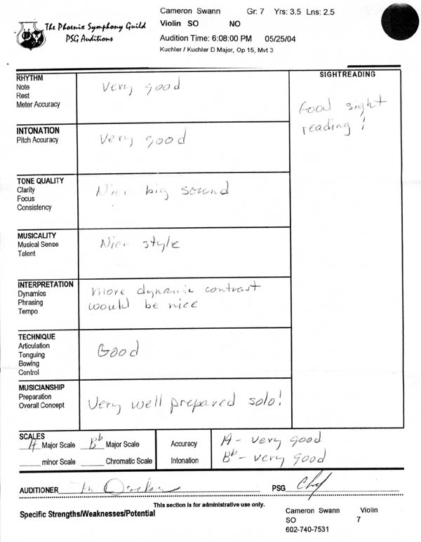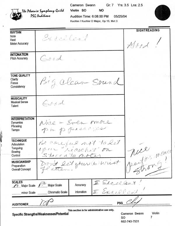 The picture above is from the warm-up room for students who were waiting, earlier this year, to audition for the Phoenix Symphony Guild's Youth Orchestras. My son Cameron was one of the nervous young auiditees, and that room was a real eye-opener for him. He had grown used to being the best violinist in his age cohort, and it was a silence-inducing surprise to him to discover that there are child-fiddlers very much better-trained than he is. The dishwater blonde in the foreground, for instance, played a rich and spirited Paganini violin concerto--from memory. Even so, Cameron bowled 'em over. He has the ability to take his game to a completely different level when the pressure is on, and his audition was sufficient to win him a place among all these young prodigies. You can see the evaluations of his auditors here and here. He's making a lateral move from big-fish/small-pond to swimming with a much faster school. We are too much in love with this outcome, since it puts him among precisely the kinds of children we want him working with, playing with, competing against. And this is my wife Cathy's triumph as much as it is Cameron's. I care about the boy's honor and integrity, about his ability to read, to write and to reason. But it was Cathy who pushed this violin thing to the point where it is amounting to something. Cameron has great skills--good hands, a good ear and a talent for sight-reading anything. But if Cathy hadn't pushed him and pushed him and pushed him, his raw talent would have gone undeveloped. Three cheers for Cameron, but three cheers for Cathy, too. We live in a time when too many children do nothing but gorge themselves on empty desserts. Tonight Cameron gets to savor the feast of true accomplishment. To him: Bravo! |